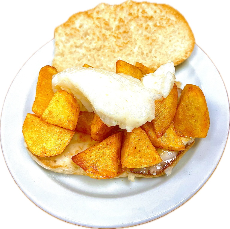 - Mollete CortijeroPatatas bravas con ajo-aceite.