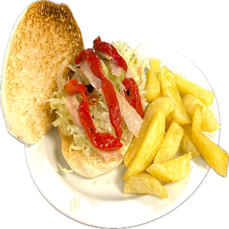 - Mollete MediterráneoVentresca de atún, pimiento asado, iceberg y aceitunas (con p. fritas).